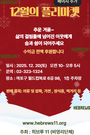 정성으로 커피와 쿠키를 만들던 어느날 억울해서 숨쉬기도 버거운 한 가족을 만났습니다. 그 후로도 히브루 11에서 소통과 공감을 원하는 사람들을 만나며, 억울한 일을 당한 사람들의 손을 잡아주고, 작게라도 숨통을 틔워주자는 마음이 모아졌습니다.